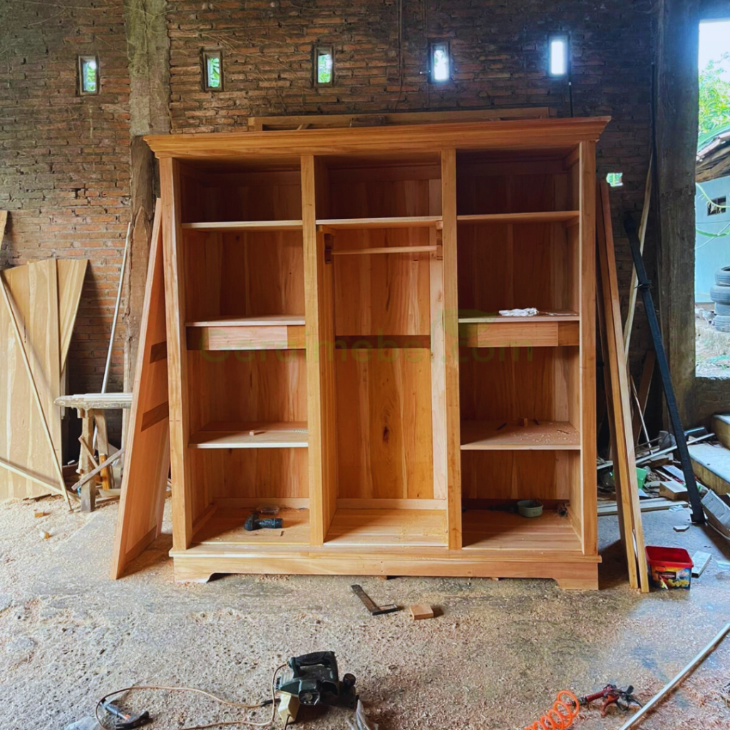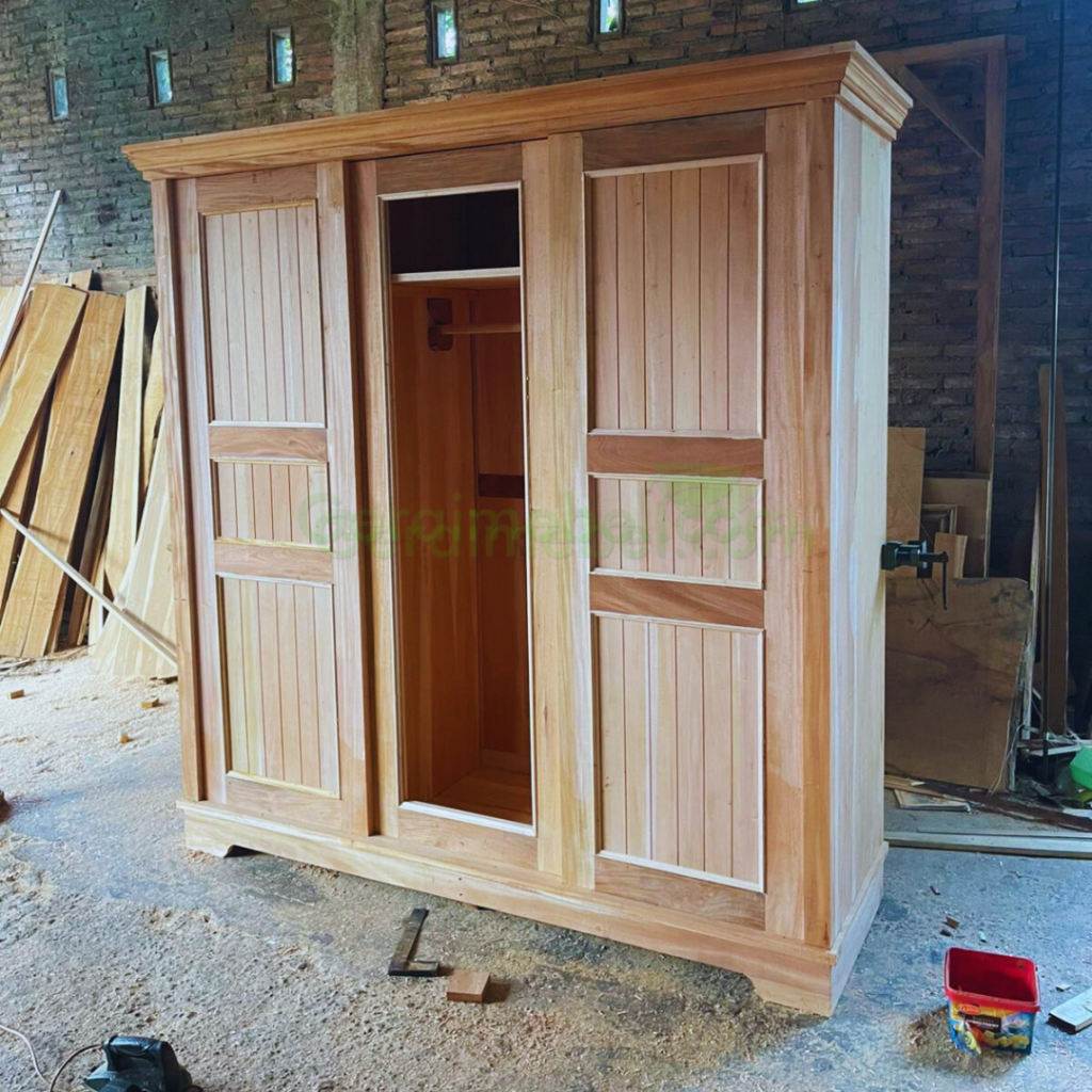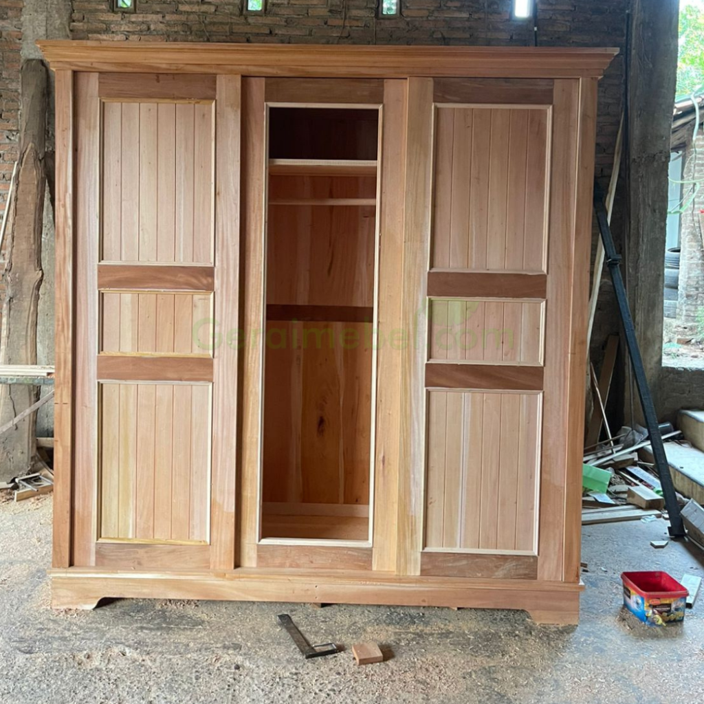 Rangka bagian dalamnya dirancang kuat untuk menahan beban pakaian, sementara rel pintu geser menggunakan besi baja ringan atau aluminium berkualitas tinggi agar pintu tetap halus dan tidak macet meskipun sering digunakan.