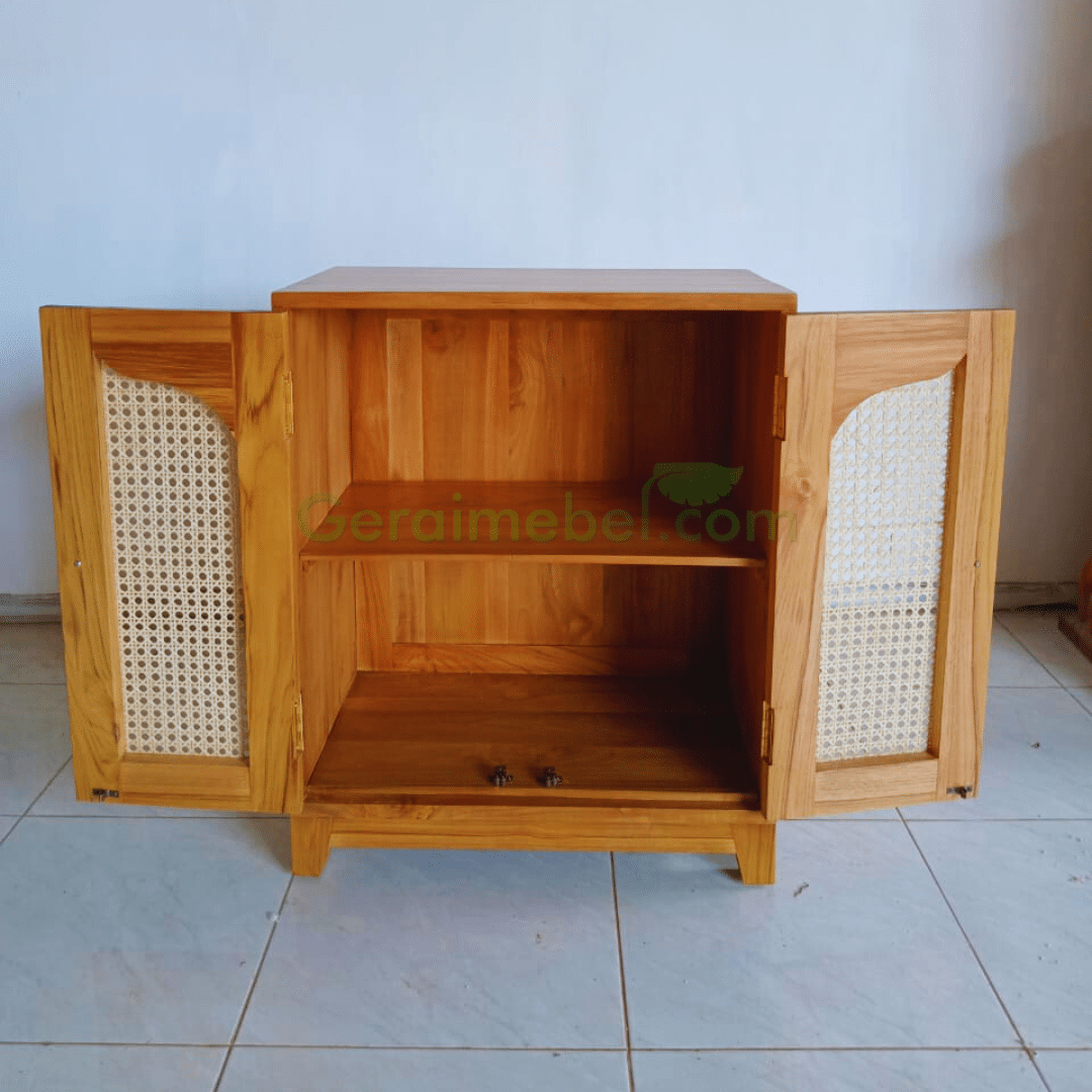 Desain minimalis dengan bahan kayu jati dan mix rotan saat ini lagi trending di dekorasi interior rumah, hotel maupun cafe. Seperti Lemari Rotan Minimalis Mini Mix Rotan Alami sangat cocok anda gunakan untuk tempat penyimpanan sekaligus pelengkap ke estetikan sebuah ruangan.