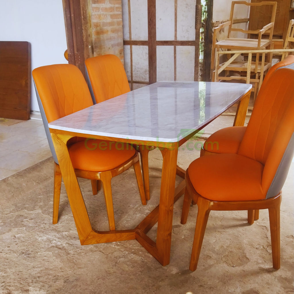 Selain keindahan marmer, meja ini didukung oleh rangka kayu solid yang kokoh. Kayu jati pilihan membuat struktur meja menjadi stabil, awet, dan tahan lama. Bahkan, kombinasi marmer dengan kayu memberikan kesan harmonis antara kemewahan modern dan nuansa natural. Tidak heran jika meja makan jenis ini banyak dipilih oleh keluarga maupun pebisnis untuk restoran atau kafe eksklusif.