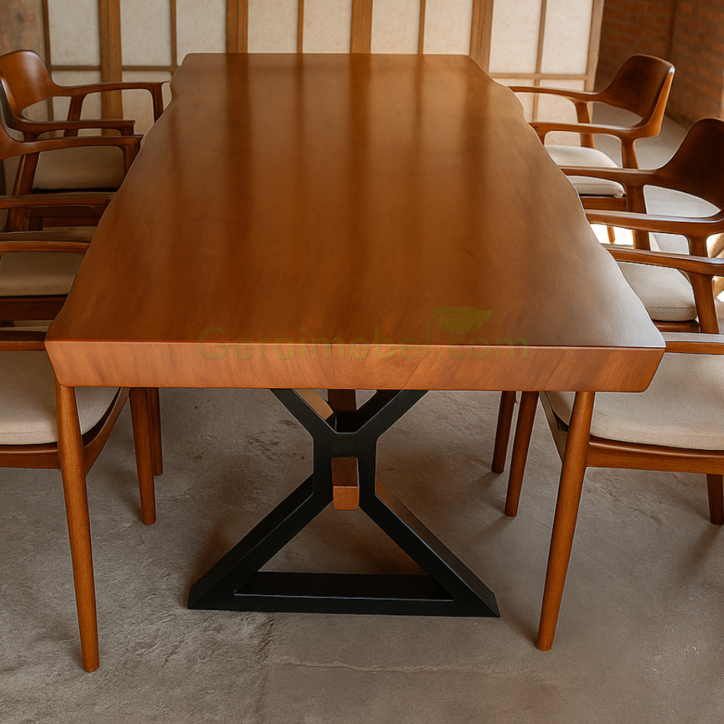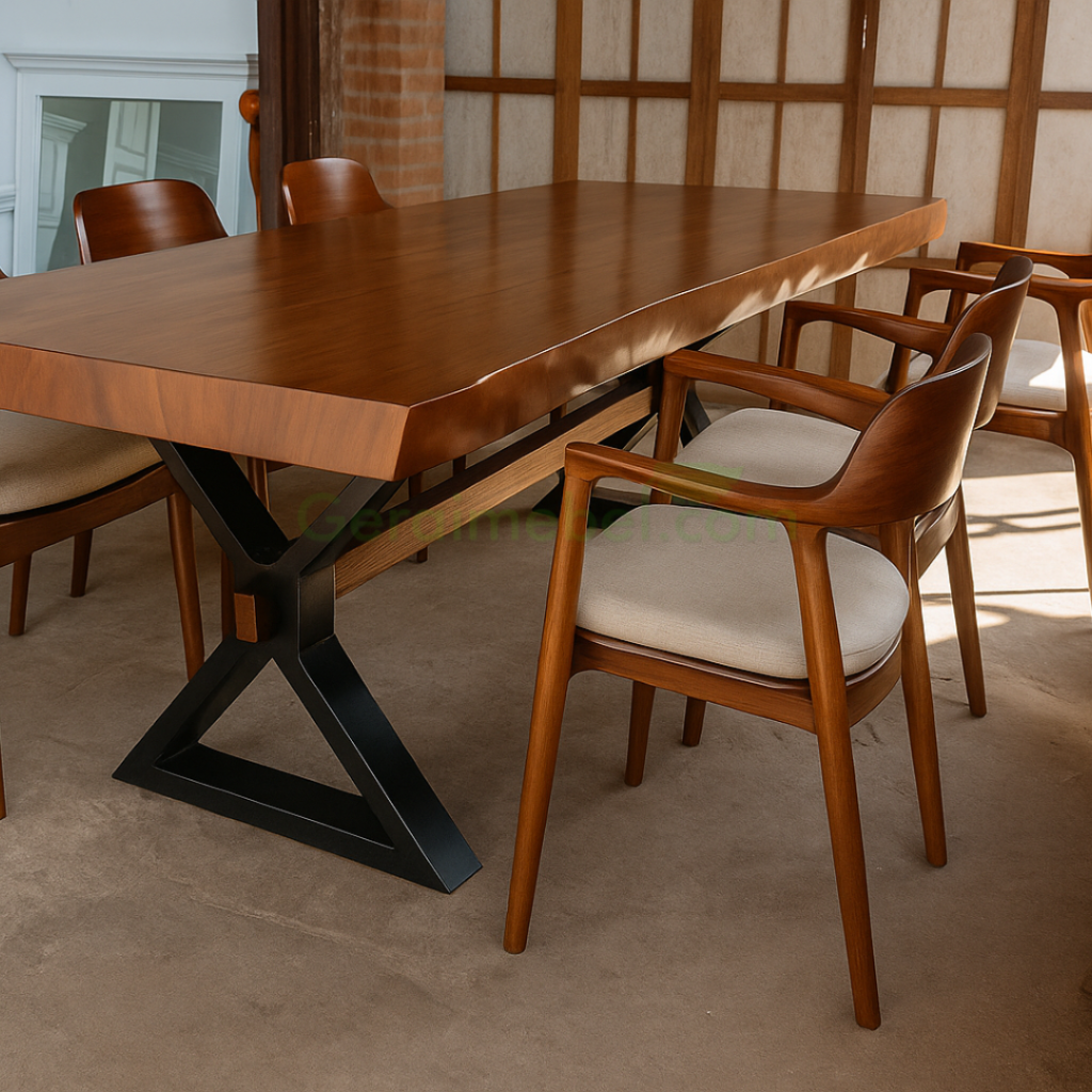 Gambar di atas memperlihatkan kombinasi sempurna antara kekuatan desain modern dan pesona alami kayu solid. Permukaannya halus, tebal, dan memiliki pinggiran alami (live edge) yang mempertegas kesan alami tanpa kehilangan nuansa kontemporer.