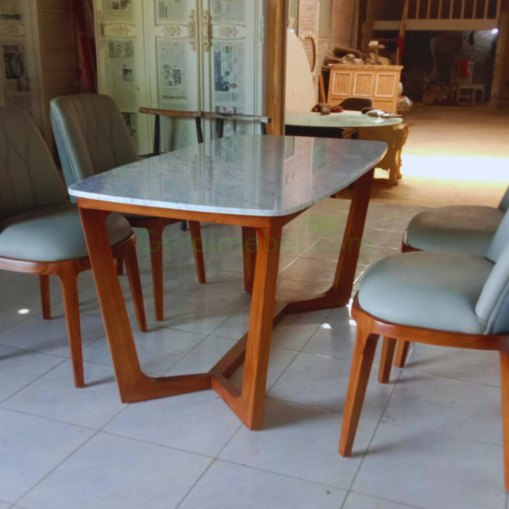 Desain set meja makan ini memadukan gaya modern minimalis dengan karakter alami kayu jati. Permukaan meja dilapisi top marmer berwarna abu keputihan yang memberikan kesan bersih, luas, dan elegan. Kaki meja berbentuk geometris dari kayu solid memberikan kekuatan struktural sekaligus nilai estetika yang tinggi.