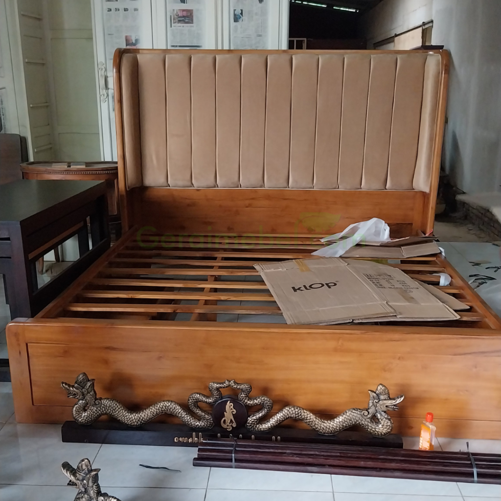 Di bagian bawah ranjang terdapat ukiran ornamen naga artistik yang memancarkan karakter kuat dan eksklusif. Unsur ini bukan hanya dekoratif, tetapi juga mencerminkan identitas budaya dan kemewahan yang khas dari seni ukir Jepara.